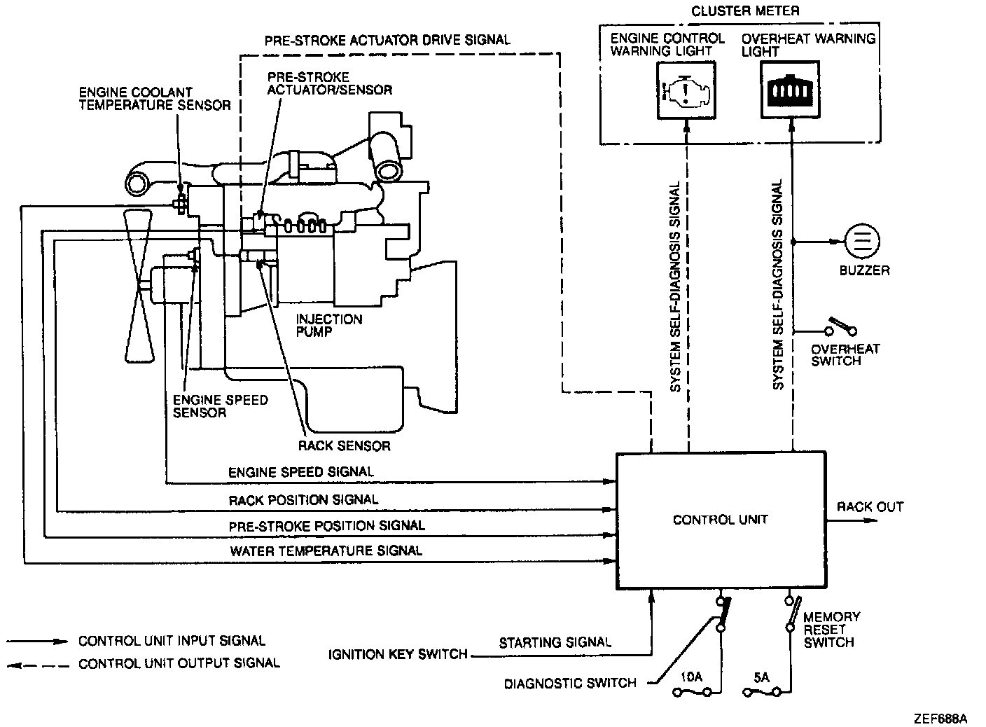 The MD-TICS system consists of the control unit, the pre-stroke actuator that is actuated by the signal from the control unit, the sensors (engine speed sensor, rack sensor, engine coolant temperature sensor, and pre-stroke sensor) that read the operating condition of the engine and give signals to the control unit, the switches and lights, and the electrical wiring.