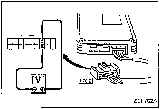 2. Measure voltage between terminal (3) (+ end) and terminal (12) (- end) of instrument harness connector [I-70-2].