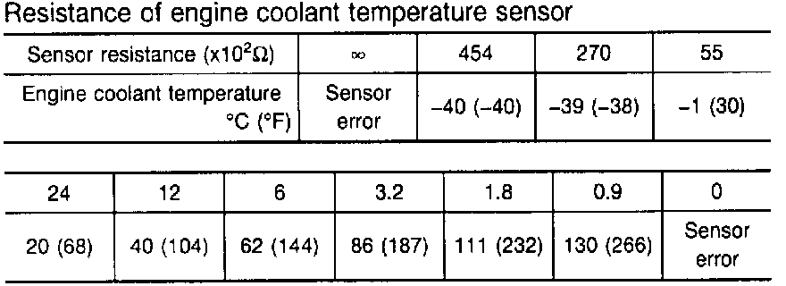For details of the resistance value of the engine coolant temperature sensor, see the table for [CHECK/1].
