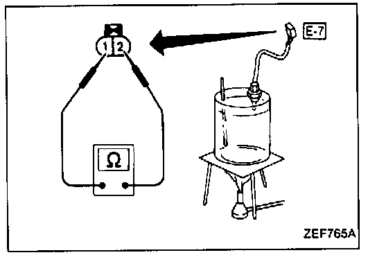 1. Measure the resistance between terminals (1) and (2) of engine coolant temperature sensor harness connector [E-7].