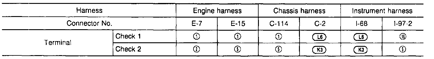 1. Check for continuity, short circuit, and insulation between instrument harness connector [I-97-2] and harness connector [E-7] of the engine coolant temperature sensor.