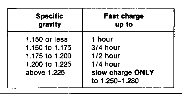 If battery level is low and water is added, fast charge battery for a few minutes after battery begins gassing (boiling). Slow charging current should be approximately 10% of battery capacity. Fast charging should be approximately 80-90% of battery capacity. Remove cell caps while charging