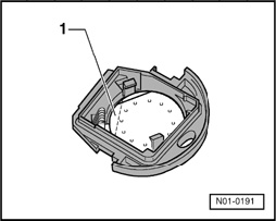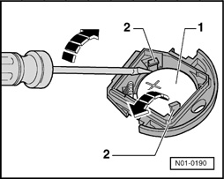 - Unclip upper battery - 1 - from retainers - 2 - with screwdriver in direction of arrow.
