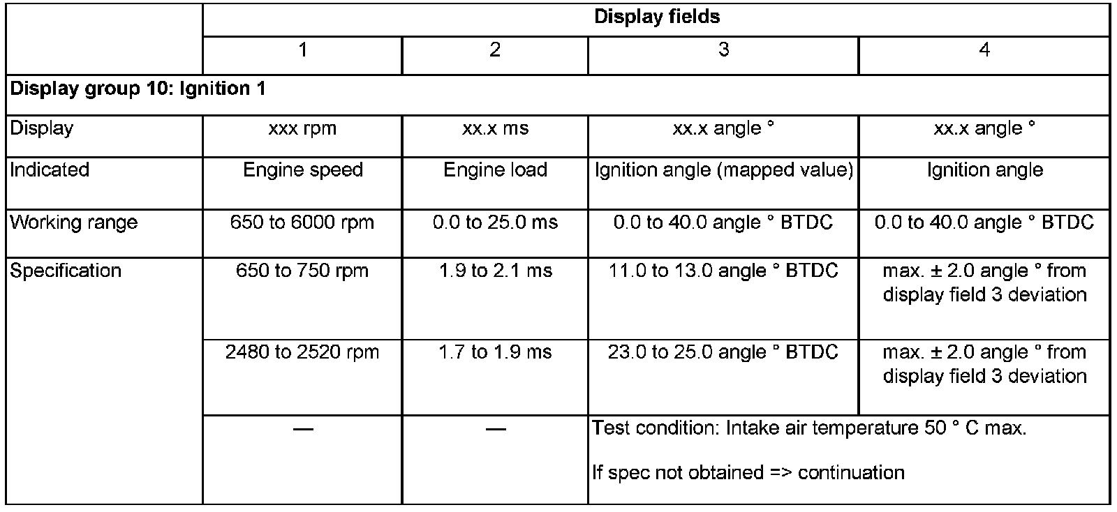 - Check ignition timing control specifications (Display fields 1 to 4):