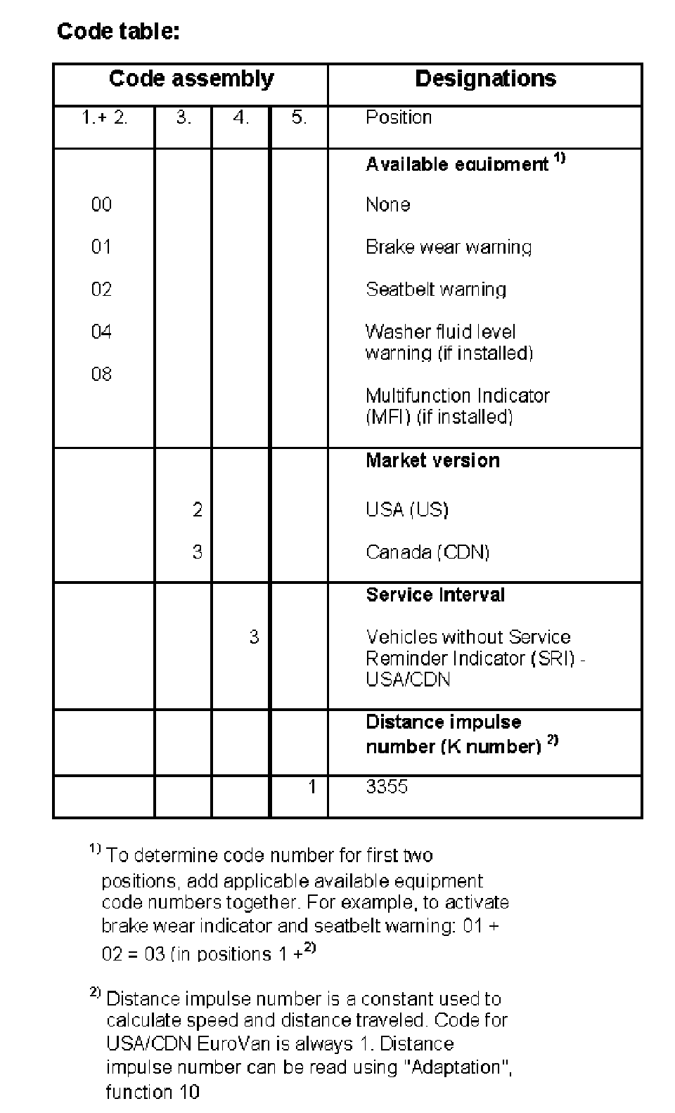 - The code table lists only those combinations applicable to the VW EuroVan.