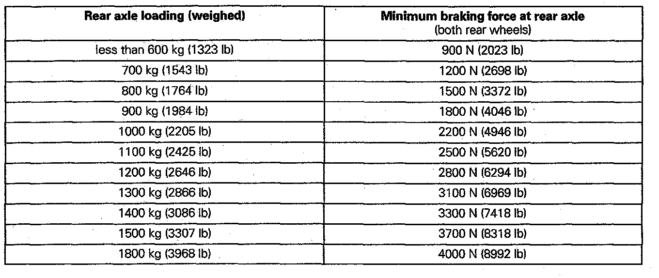 The following table shows the minimum braking force at the rear axle dependent on the actual axle loading when the vehicle is stationary.