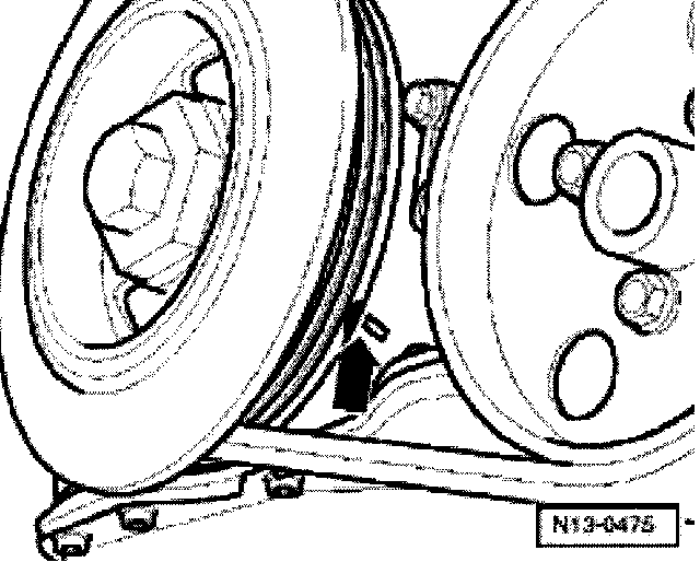 - Adjust crankshaft at securing bolt of harmonic balancer in direction of engine rotation to TDC cyl. 1 marking (arrow).
