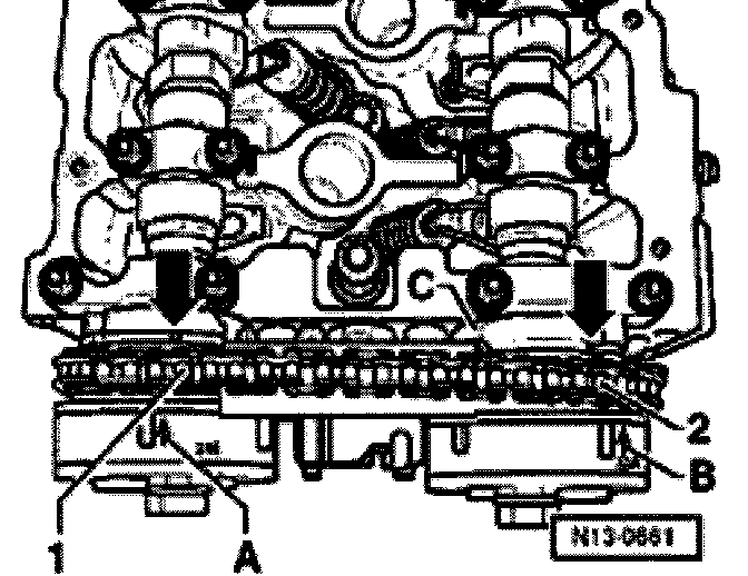 - Markings -A- and -B- on the camshaft adjusters must match the notches (arrows) of control housing -C-.