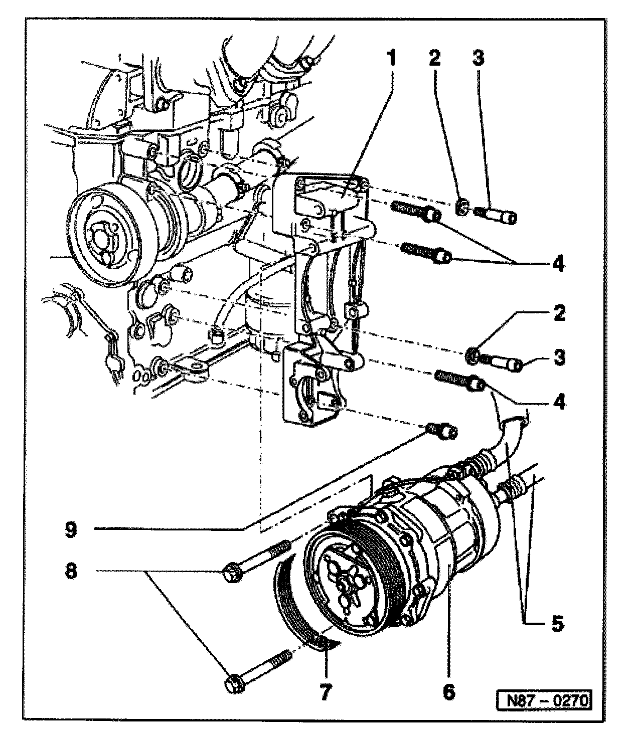 - Loosen bolts -8-, knock-back clamping sleeves on compressor, then remove bolts completely.