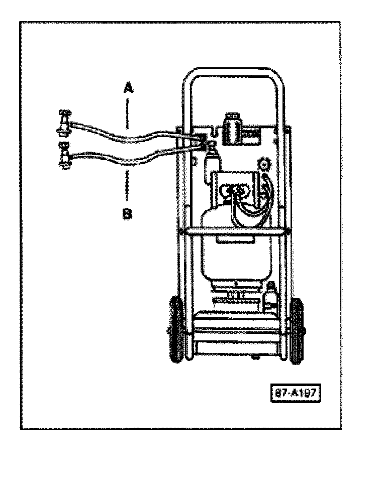 - Connect red high-pressure hose -A- of refrigerant recovery/recycling/recharging unit to high side fitting on vehicle and open coupler valve.