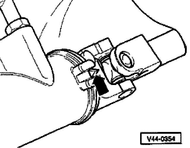^ Bring steering gear into center position. To do so, turn steering wheel from stop to stop and count rotations. Turn steering wheel back half of the rotations. Use tab (arrow) to align steering spindle exactly at rubber disc and notch in housing. Tab and notch must line up.