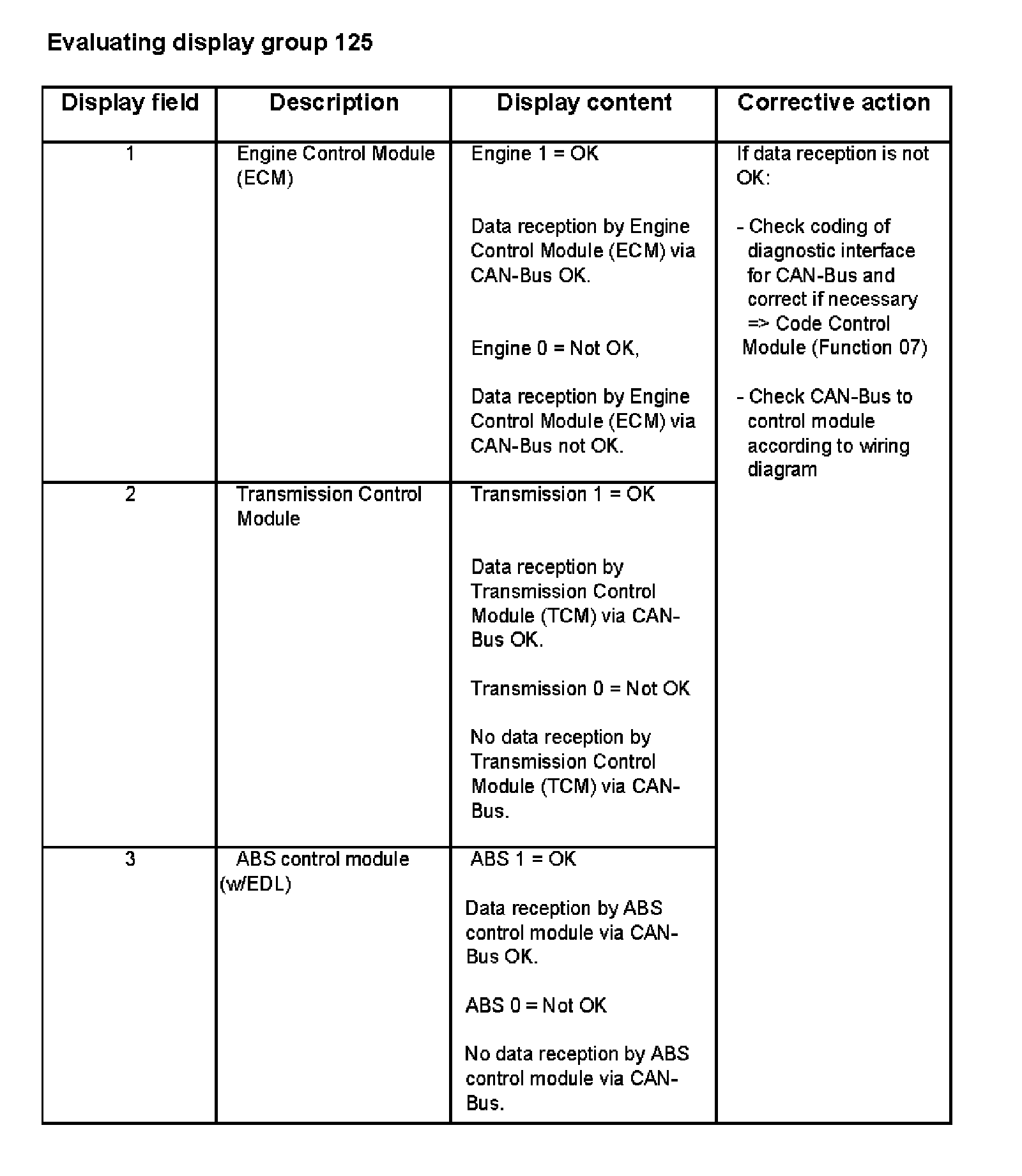 - Display fields in display groups 125 to 127 provides the CAN-Bus function status codes of various control modules connected to the vehicle CAN-Bus network.
