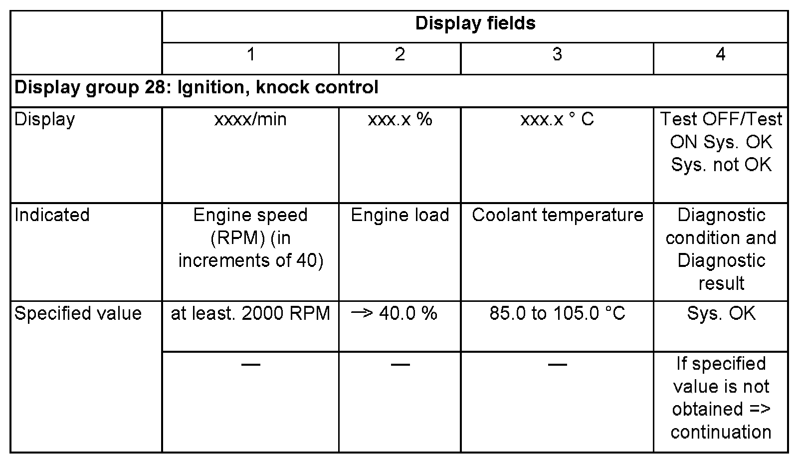 - Perform a road test and (have a 2nd person) observe the specified value for knock control on the display (display field 4).