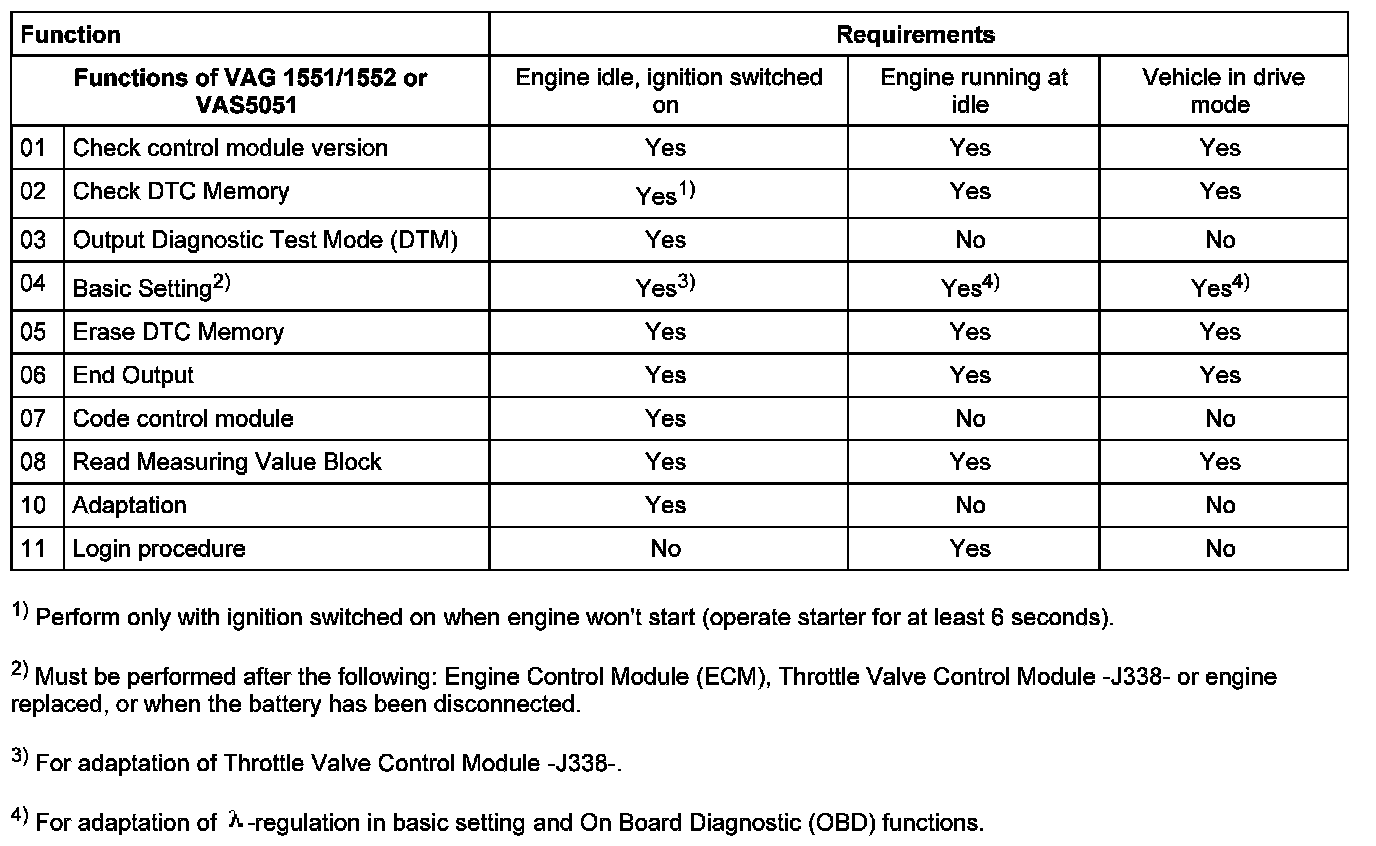 Selectable Functions When Using VAG 1551/1552 Or VAS 5051