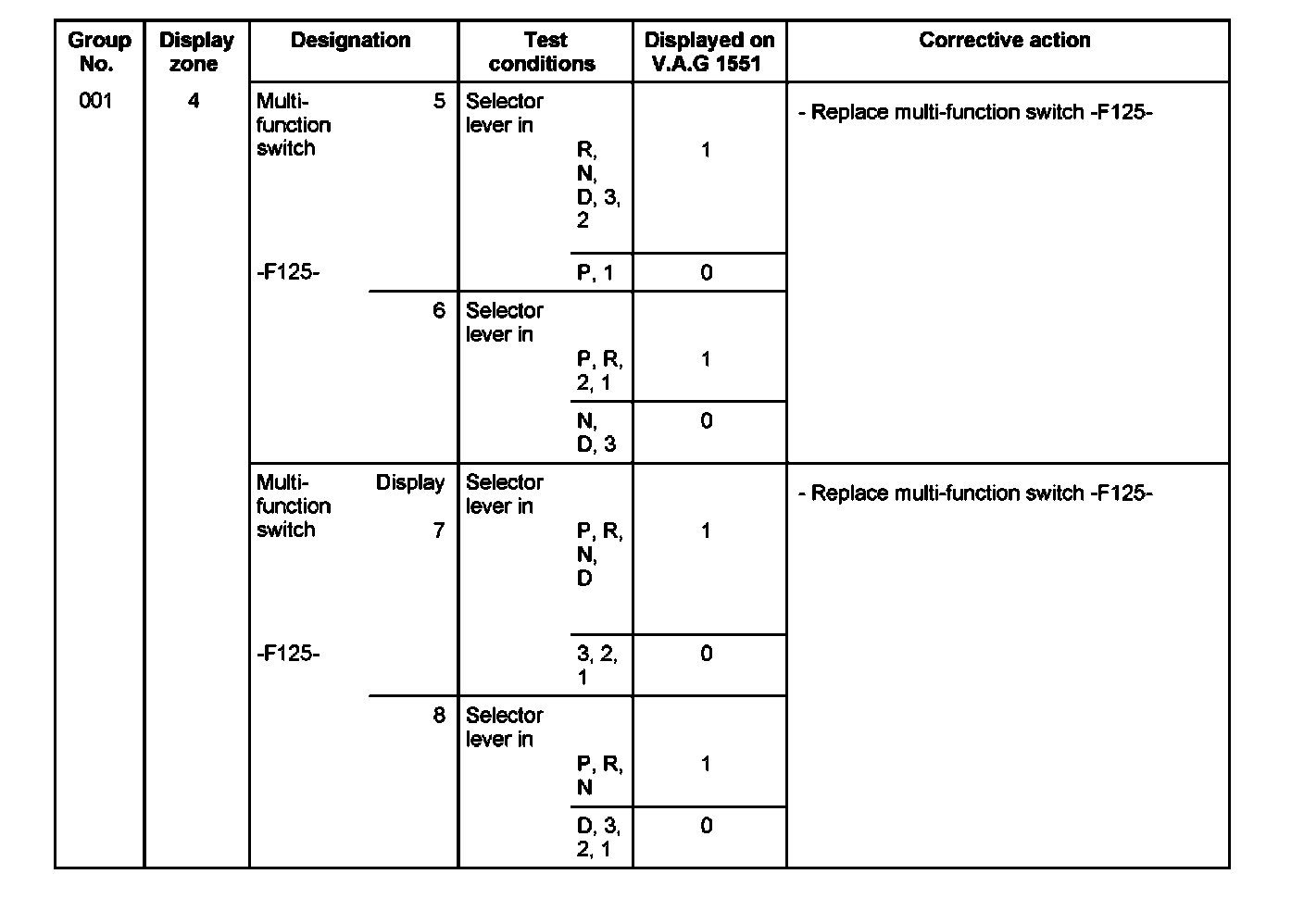 ^ The table shows the solenoid valves -N88-, -N89-, -N90- and -N91- as controlled in each selector lever position. These solenoid valves control the switching valves to the relevant gears.