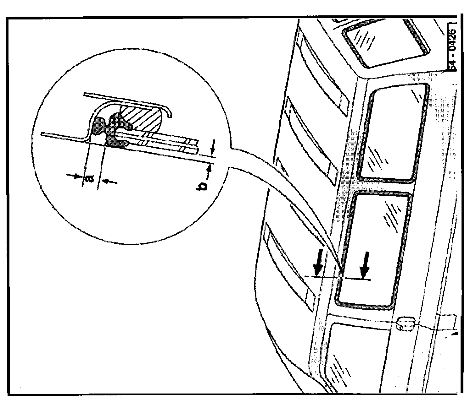 NOTE: Windshield, rear, and side windows are flush-bonded in window opening with 1K PUR adhesive.