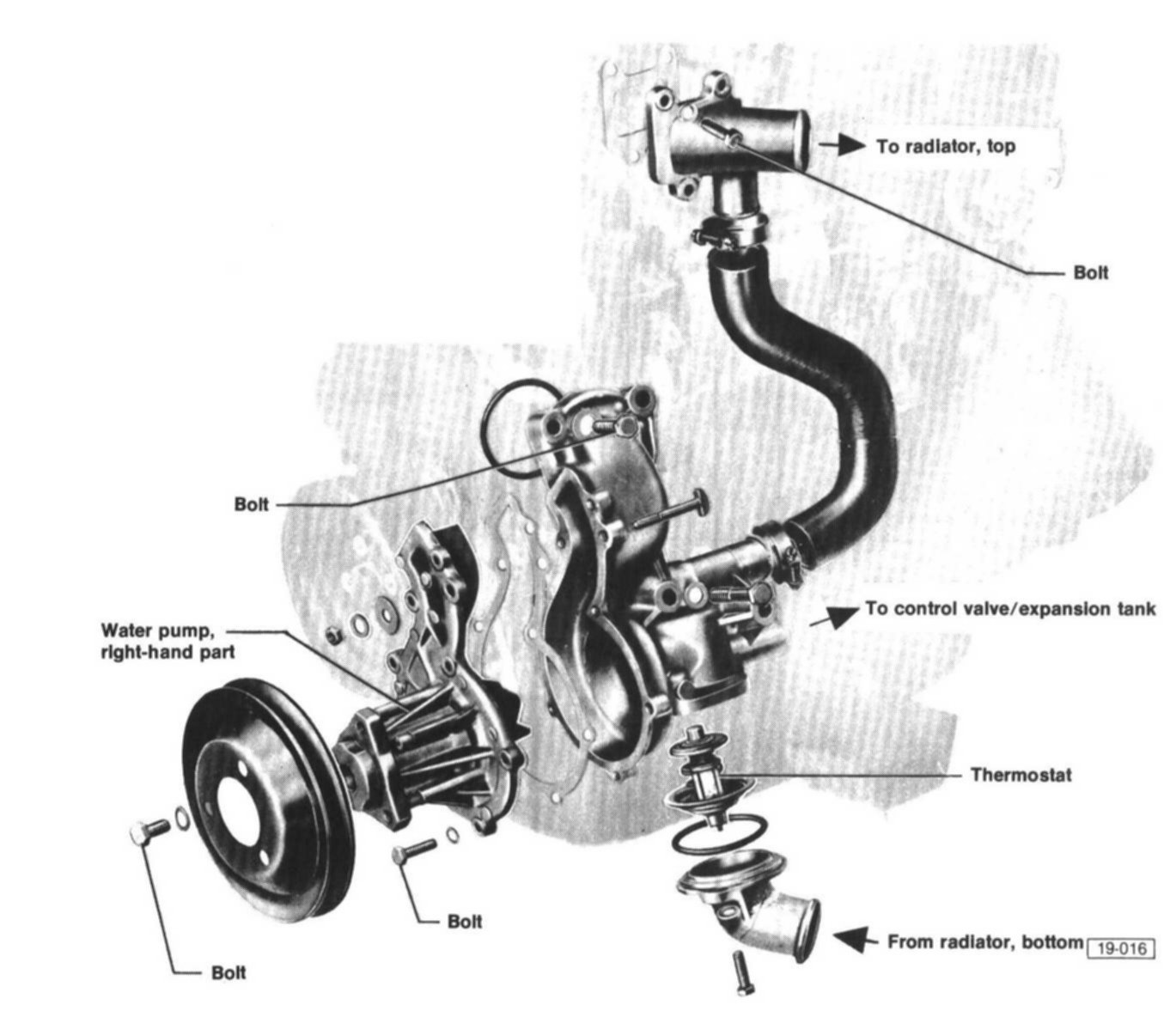 The right-hand part of the water pump, which contains the shaft, the seals, the bearing, and the impeller, can be replaced separately. However, you can avoid removing the camshaft drive belt and sprockets by removing the water pump as a unit before you disassemble it.