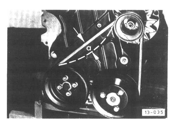 - On vehicles without power steering, install the V- belt on the crankshaft pulley, the water pump pulley, and the alternator pulley. Then adjust the V- belt tension by pulling the alternator away from the engine until dimension a is correct when you depress the V-belt.