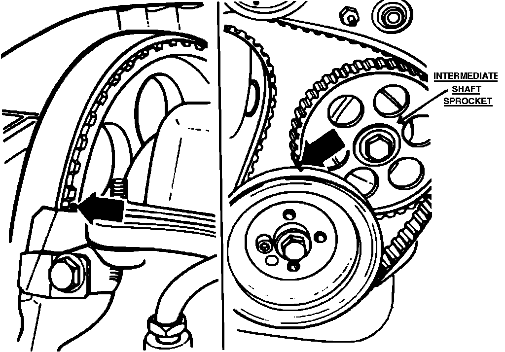 Align the mark (can be a dot or notch) on the intermediate shaft sprocket with the notch in the crank pulley. Align the mark (can be a dot or notch) on the "Back" of camshaft sprocket with the top edge of the valve cover gasket. Be sure all the timing marks are properly aligned.