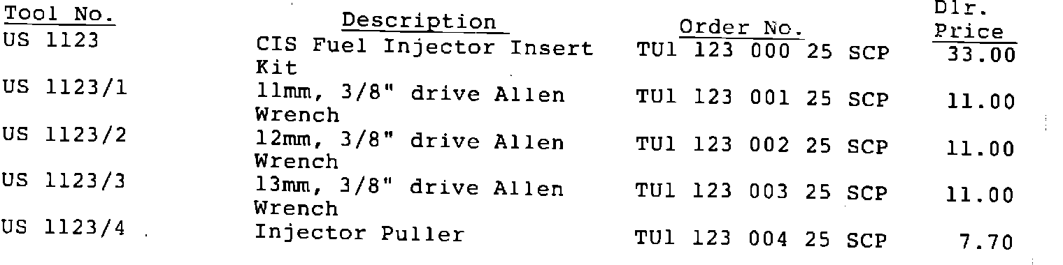Special Tool US 1123 is a specially designed CIS Fuel Injector Insert Kit. The kit contains three 3/8" drive allen wrenches; 11 mm, 12 mm and 13 mm for removing and replacing CIS fuel injector inserts. Also included is a unique device for "pulling" the injector. This tool kit is destined to become a valued addition to any technicians tool box.