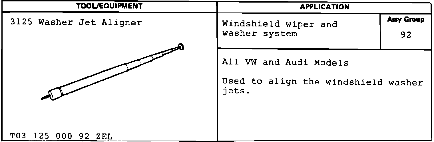 Special Tool 3125 is a clever telescoping device used for aiming windshield washer jet nozzles on all Volkswagen and Audi models. Placed in the hands of your service write-up person or technician, this tool can reduce the time required to properly align the windshield washer jets. The windshield washer jet aligner is supplied with an allen wrench and spare tips.