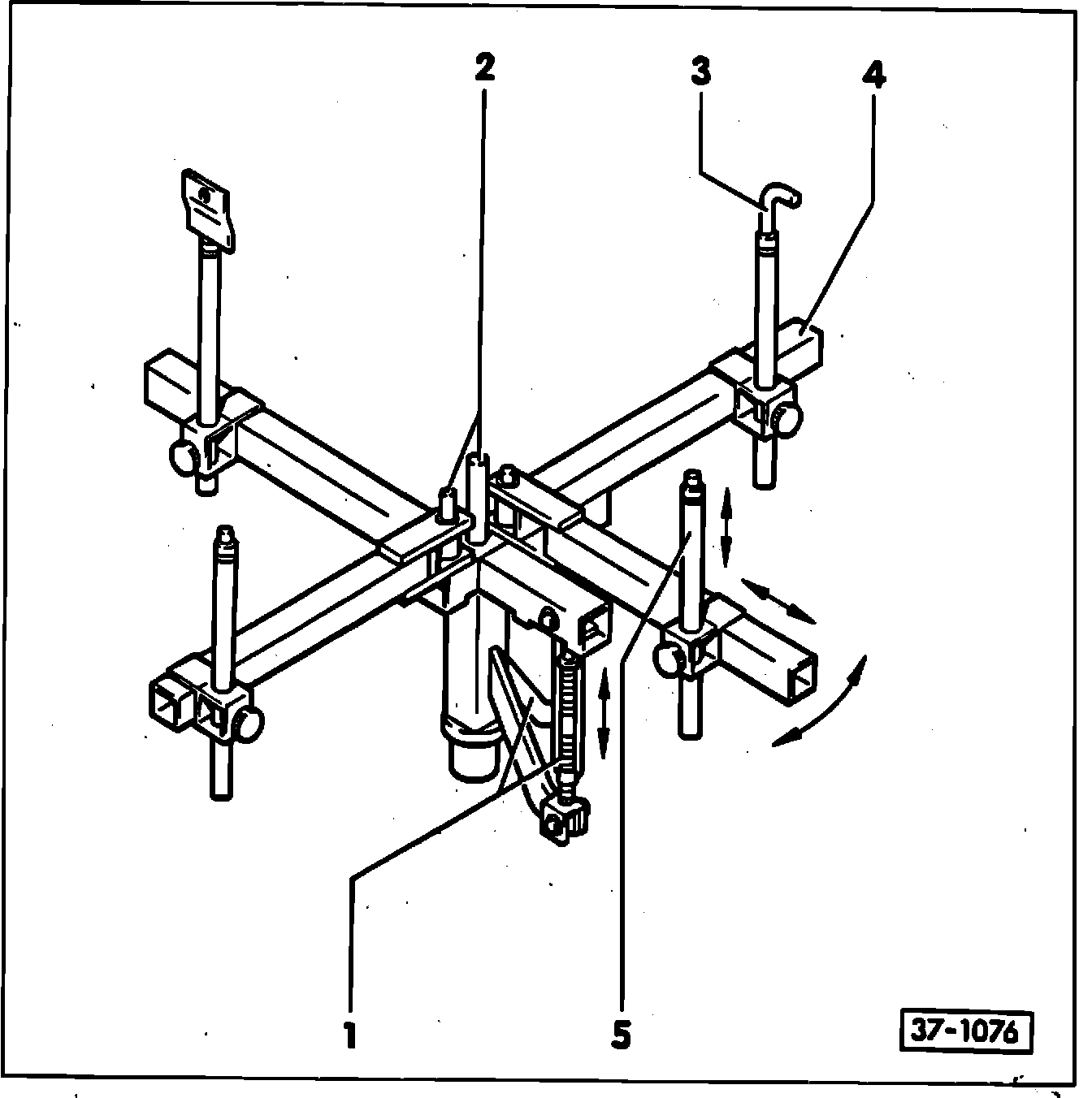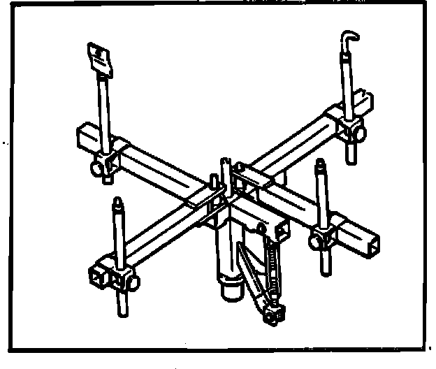 The support is equipped with four arms that can be swiveled, each with a holding arbor that can be moved laterally and up and down. The arbors are aligned with adjusting plates and can be used with changeable support heads for different transmissions.