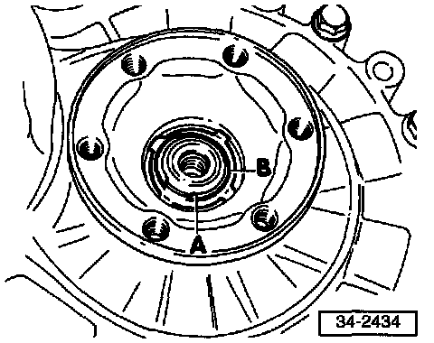 - Remove circlip (A) and dished washer (B) for drive flange