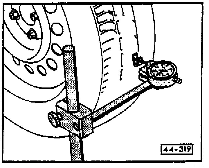 Set up the dial gauge so that needle is just making contact with center of tire wall. Slowly rotate the wheel by hand; read off needle deflection
