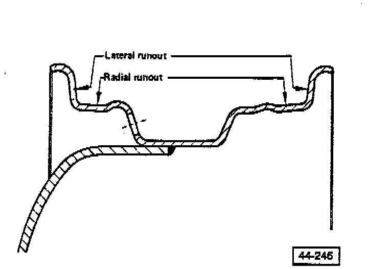 - Check radial and lateral runout of the wheel at both flanges (install wheel without tire on balancing machine or on vehicle)