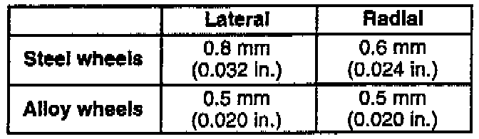 Check radial and lateral runout of both steel and alloy wheel and tire assemblies as follows: