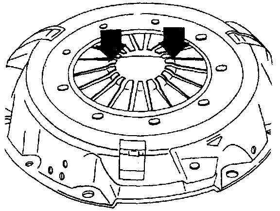 5. Inspect the clutch pressure plate. Check the release levers for bending, misalignment, or scoring. If the release bearing contact surface on the release levers is scored deeper than 0.30 mm (0.012 in.), the pressure plate should be replaced.