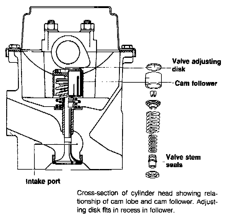 The clearance between the heel of the cam lobe and the bucket-type cam follower is adjustable by means of the replaceable adjusting disks (shims).