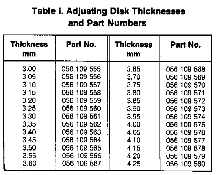 The adjusting disks are available in twenty-six different thicknesses from 3.00 to 4.25 mm (.1181 to .1673 in.). The disks most frequently required in making adjustments fall in the thickness range of 3.55 to 3.80 mm (.1397 to .1496 in.). Table I lists the available disks by thickness and part number. The thickness of each disk is etched on its underside.