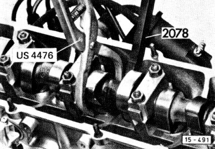 5. If either the intake or the exhaust valve clearance is incorrect, write down the actual clearance that you have measured. Then depress the cam followers and lift out the adjusting disk(s) using the special tools (US 4476) and (VW 546) for (1980 through 1982 vehicles), or (US 4476) and (2078) for (1983-1987) vehicles.