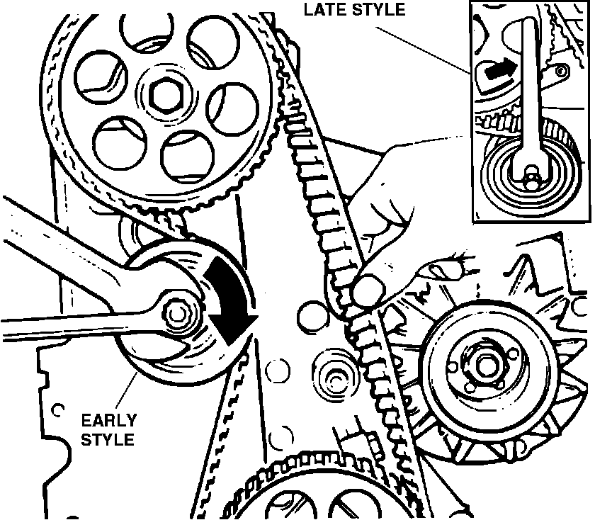 NOTE: On high mileage engines, failure of the tensioner bearing is a possibility. Consider replacing the bearing when replacing the timing belt.