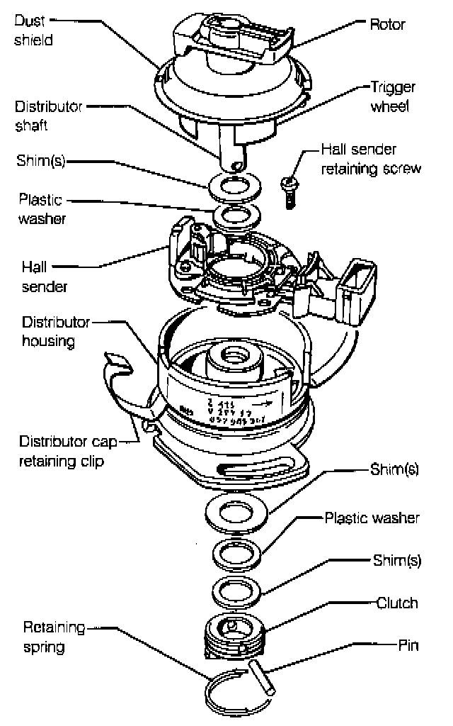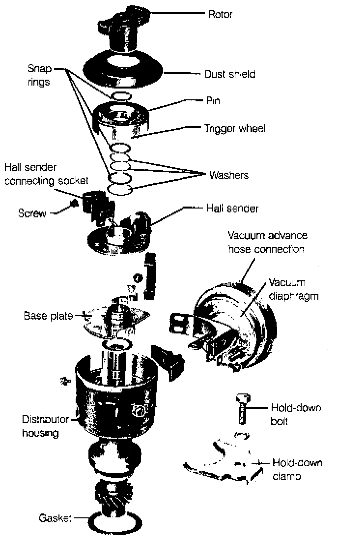 The Hall sender, the trigger wheel, the vacuum diaphragm, the suppression shield, and the dust shield are all available as replacement parts, but replacement is not routinely necessary. The distributor housing parts, including the centrifugal advance mechanism and shaft bushings, are not available. The distributor housing must be replaced as a unit.