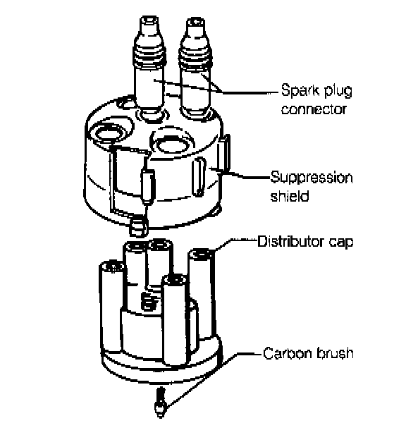 Fig. 5-3. Distributor cap with suppression shield used on all engines. Suppression shield is grounded by distributor cap attachment clips.