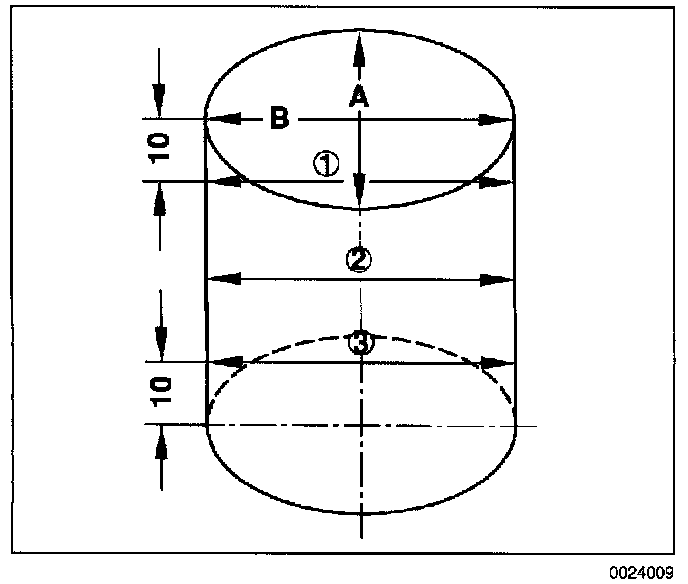 [1]: Measure cylinder bores in direction perpendicular to the crankshaft (A) and parallel to the crankshaft (B) at the top, middle, and bottom of piston travel. The top and bottom measurements should be made approximately 10 mm (3/8 in.) from the ends of the cylinder.
