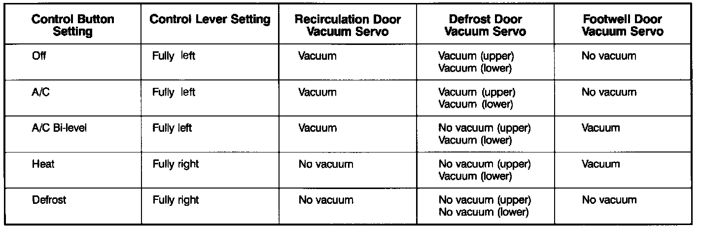 NOTE: The vacuum system supplies engine vacuum, by way of an intake manifold vacuum line, to operate the heating and ventilation control servos. The vacuum system is tested by checking for servo operation and vacuum at different control head settings. The servos are best reached by removing the instrument panel.