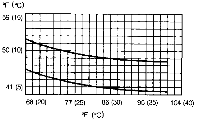 - Set the temperature lever to the extreme left, depress the A/C button, and turn the fresh air blower to HIGH. After the compressor cycles on and off once, record the temperature. Check that the reading corresponds to the graph shown.