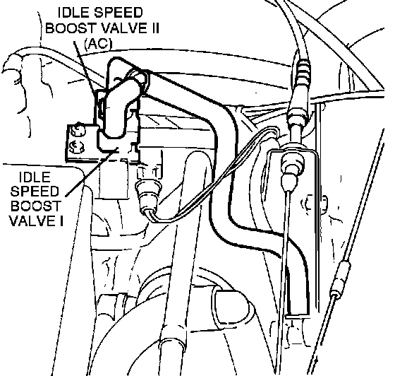 The Idle Speed Boost Valve is a solenoid valve controlled by an electronic control unit located on the fuse/relay panel that turns the valve on and off according to an engine speed signal from the ignition coil. Below 750 rpm, a control unit signal opens the valve. The valve should open with an audible click. When engine speed exceeds 1050 rpm, the control unit opens the circuit and the valve closes. The second Idle Speed Boost Valve on cars with air conditioning is switched on and off at the same time as the air conditioning compressor by the A/C relay.