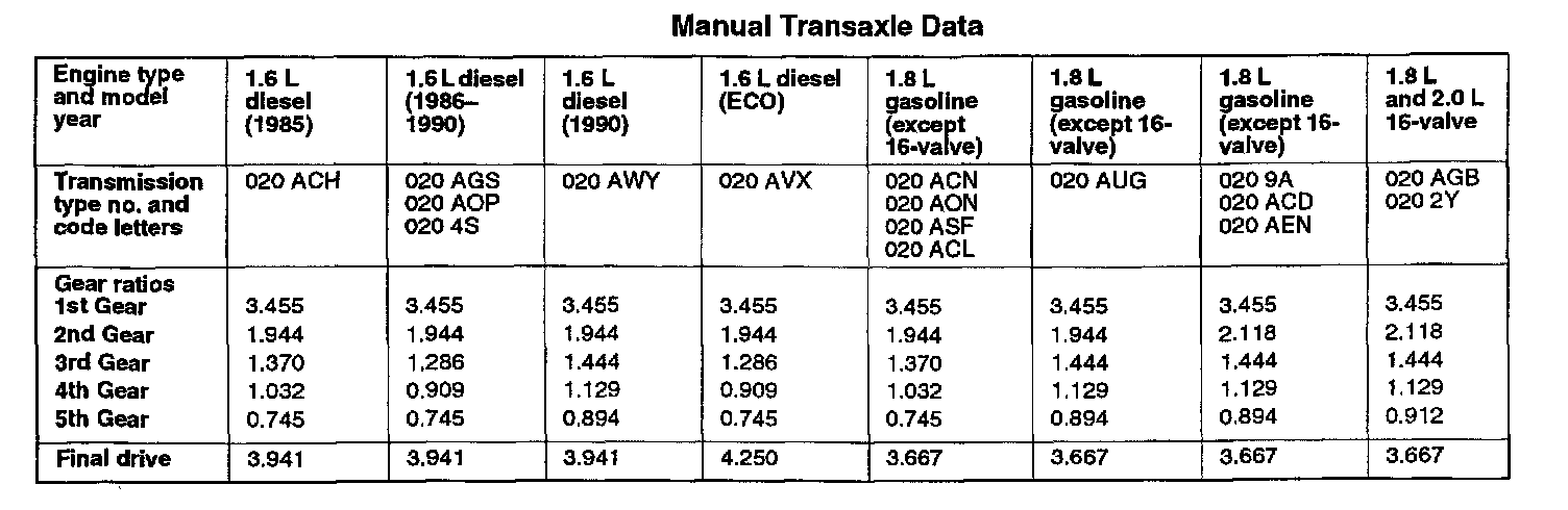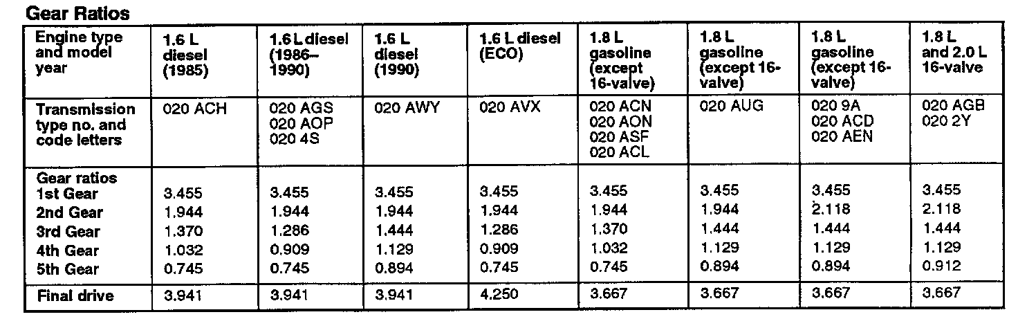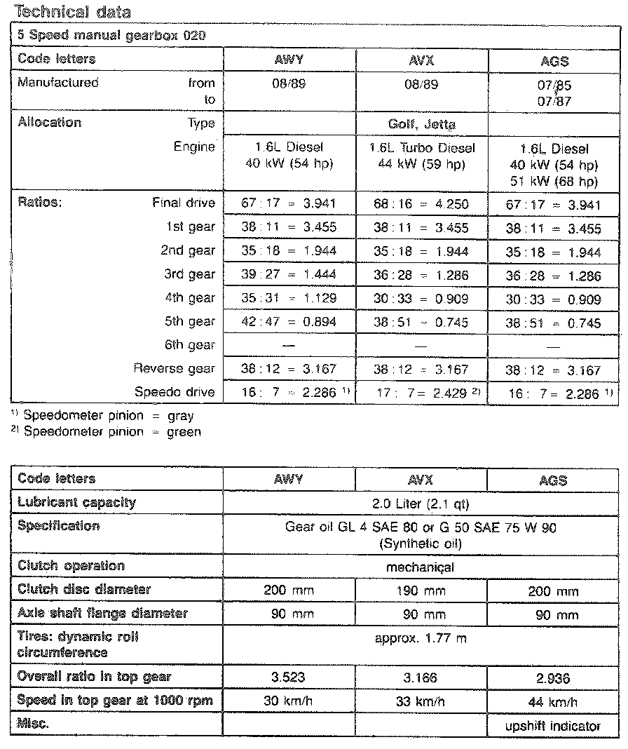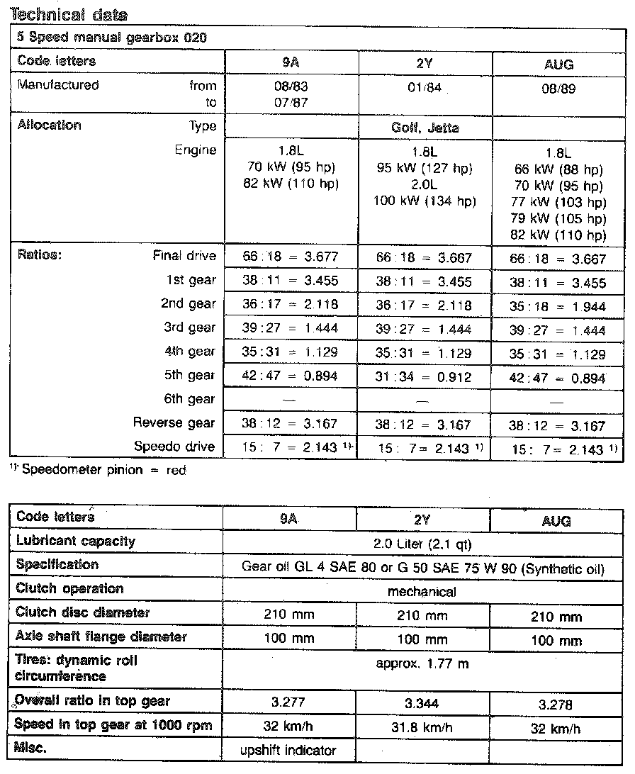 Transmission Specifications5 Speed Manual Transmission Gearbox Specifications (020):