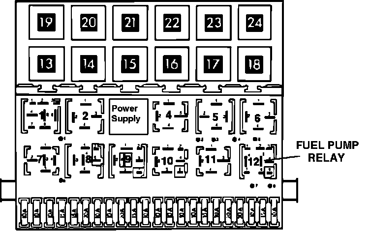 The Power Supply Relay is located in relay position #3 of the fuse/relay panel, (see diagram). The fuse/relay panel is behind the left side of the instrument panel. For access, pull on the upper edge of the recessed storage bin, then lift out the bin.
