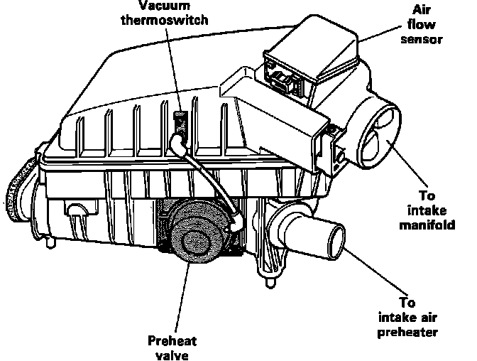 The air flow sensor is attached to the air cleaner housing at the right front of the engine compartment.
