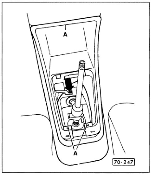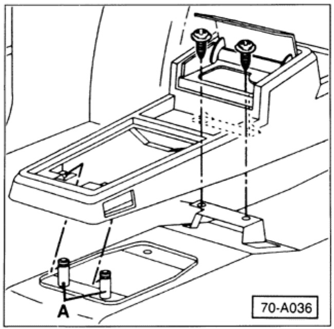 Figure above is the second type of center console showing screws to be removed. Pull console up off retaining guides A.