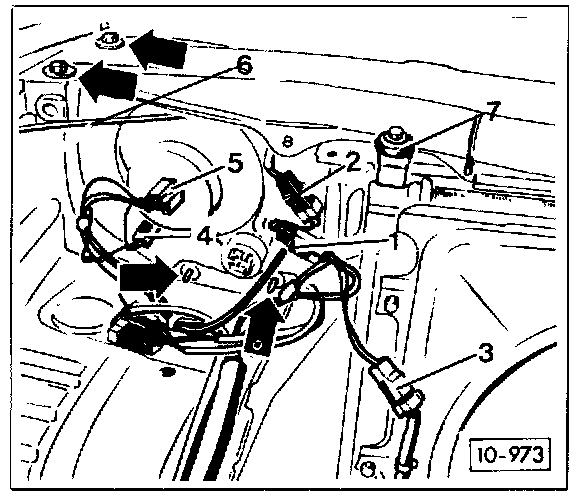 7. Disconnect the electrical connectors for the radiator cooling fan (3), the radiator thermoswitch (1 & 2), and the headlights (4 & 5). Disconnect the hood release cable (6) and the upper radiator mounts (7), and front apron mounting bolts (arrows).