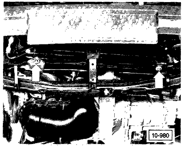 9. On cars with air conditioning, remove the condenser mounting bolts. Without disconnecting any refrigerant lines, remove the condenser and remove the air conditioning compressor from the engine. Set them aside, using care to avoid kinking the refrigerant lines.