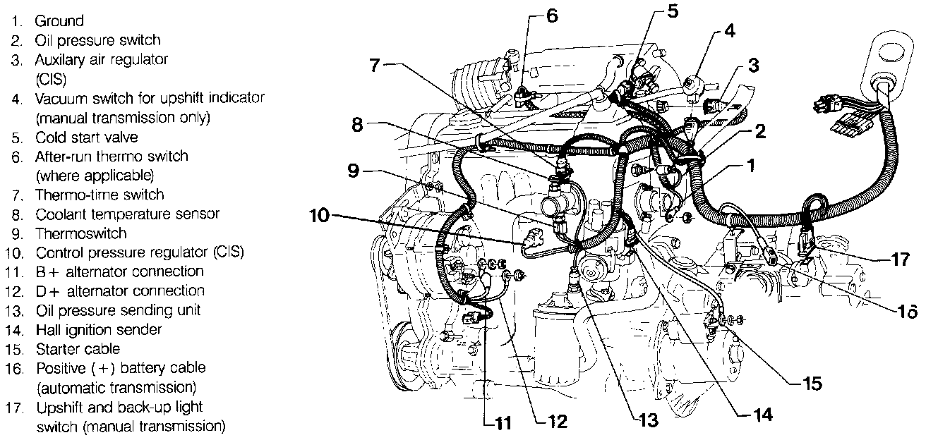 10. Disconnect all remaining electrical connections to the engine and transaxle. Typical engine and transaxle connections are shown.