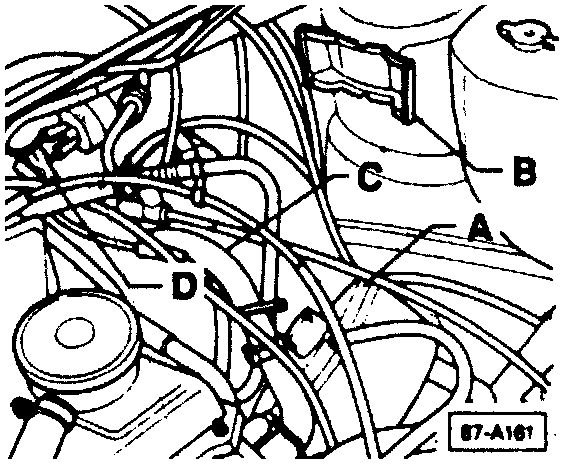 - Disconnect coil wire (D) for access to heater hose.