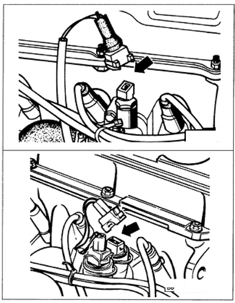 Harness connector shown disconnected from coolant temperature sensor (arrow) on models up to 1989 (top) and later (bottom)
